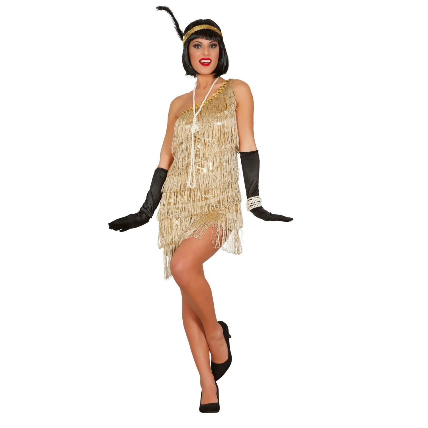 Disfraz Charlestón de color dorado para fiestas de los años 20. Un disfraz económico y de calidad para disfrazarte este año. Talla 42-44. Incluye vestido y cinta de la cabeza. No incluye ni guantes, ni zapatos ni de más accesorios. Se venden aparte.