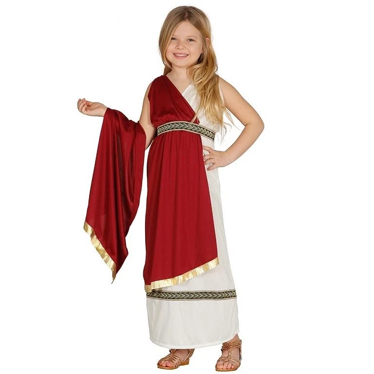 Original y completo disfraz romana, le encantará a la pequeña de la casa, sé una verdadera romana de la antigua Roma. Disfraz incluye vestido largo con capa y cinturón. Talla 5-6 años.